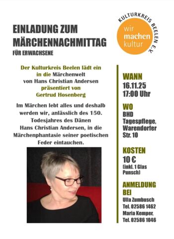 Der Kulturkreis Beelen lädt ein, gemeinsam mit Erzählerin Gertrud Hosenberg in die Märchenwelt von Hans Christian Andersen einzutauchen. Am 16.11.2025 ab 17 Uhr freuen wir uns auf einen winterlichen Nachmittag mit Gebäck und Punsch in den Räumen der BHD Tagespflege, Warendorferstraße 10, Beelen.